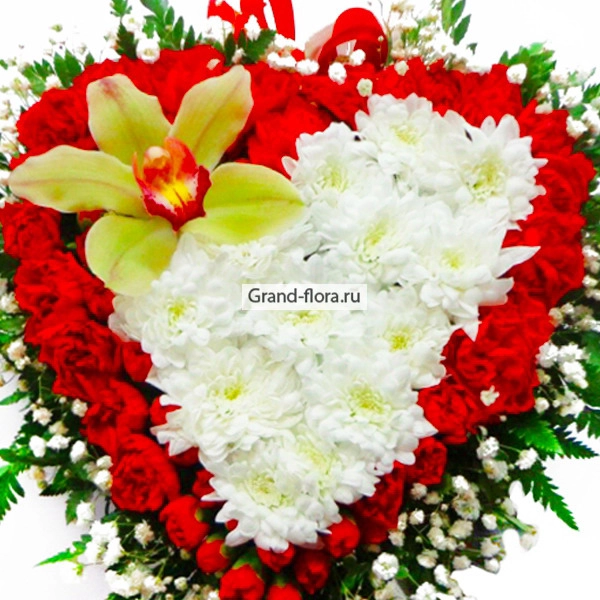Сердце Аполлона - композиция в виде сердца из гвоздик, хризантем и орхидей