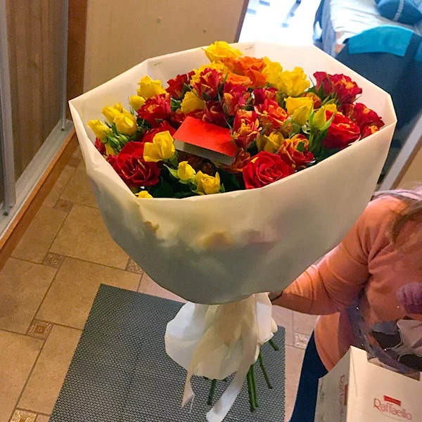 Уже который год пользуюсь Вашими услугами в разных городах и еще ни разу не не подвели меня. За что отдельное спасибо. Кустовая роза это любимые цветы моей дочери, поэтому долго не раздумывая мой выбор пал именно на такой букет. Роза свежайшая, на следующий день бутоны стали раскрываться, минимум упаковки (как я и просила). В общем дочь счастлива и мне радостно, что смогла с Вашей помощью передать ей свои поздравления, находясь далеко от нее. Благодарю.