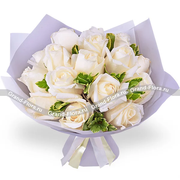 15 роз: роза белая - 15 шт., питтоспорум (возможна замена на фисташку) - 4 шт., упаковка, лента.
